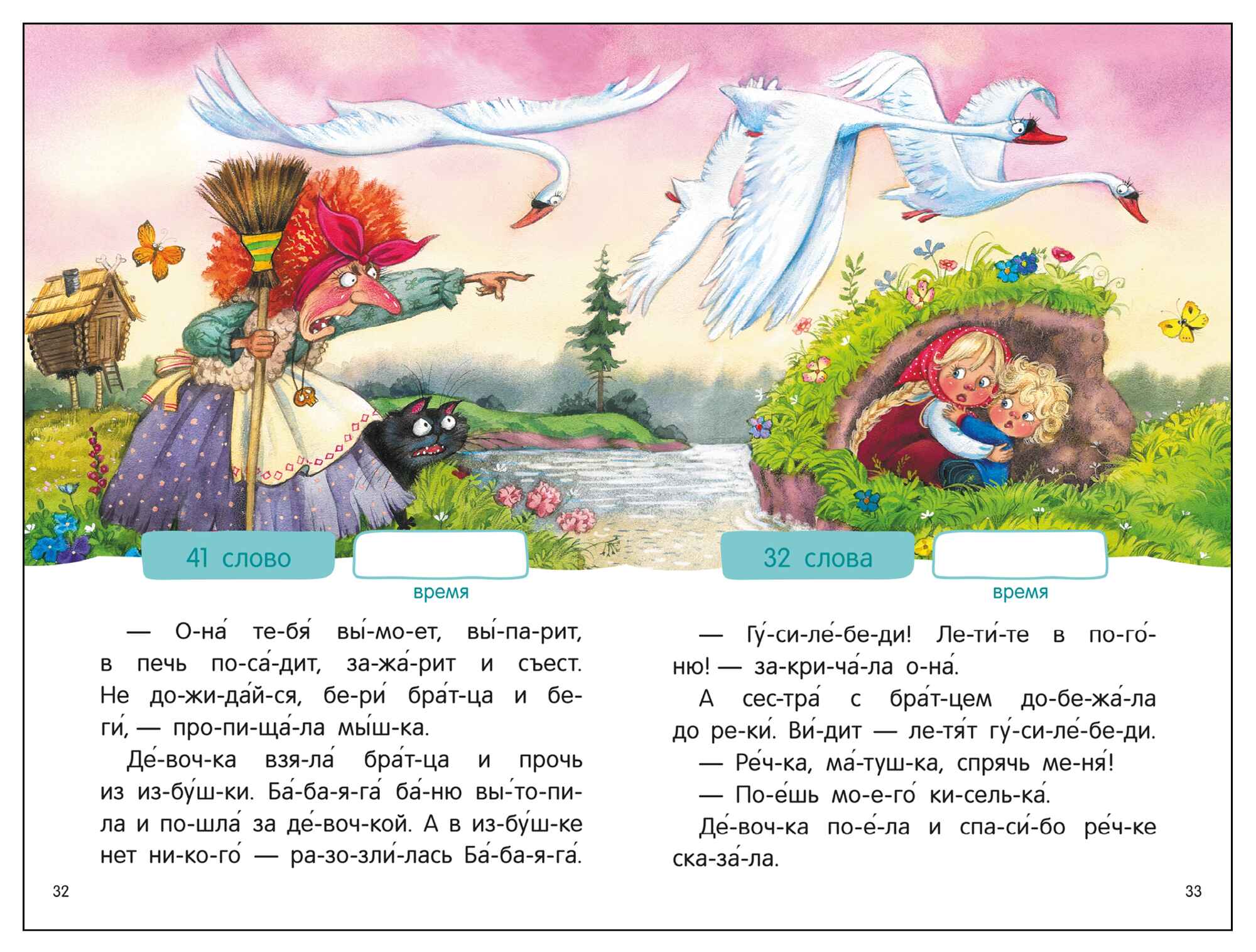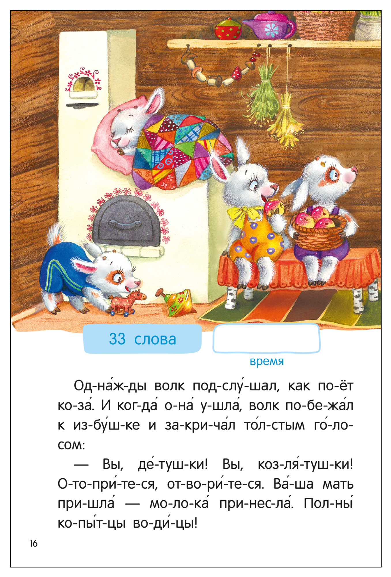 Начинать учиться читать лучше с коротких текстов. Для этого отлично подойдут адаптированные русские народные сказки. Все слова в красочной книге серии «Я читаю по слогам» разделены на слоги, а также в них проставлены ударения. В книге вы найдёте четыре популярные сказки: «Колобок», «Гуси-Лебеди», «Заюшкина избушка» и «Волк и семеро козлят». Чтобы ребенку было интереснее читать, а взрослый мог проконтролировать технику чтения, можно предложить почитать на время. Для этого на каждой странице указано количество слов и дано место для записи времени, затраченного на прочтение. Книгу небольшого компактного формата удобно держать в руках и брать с собой.