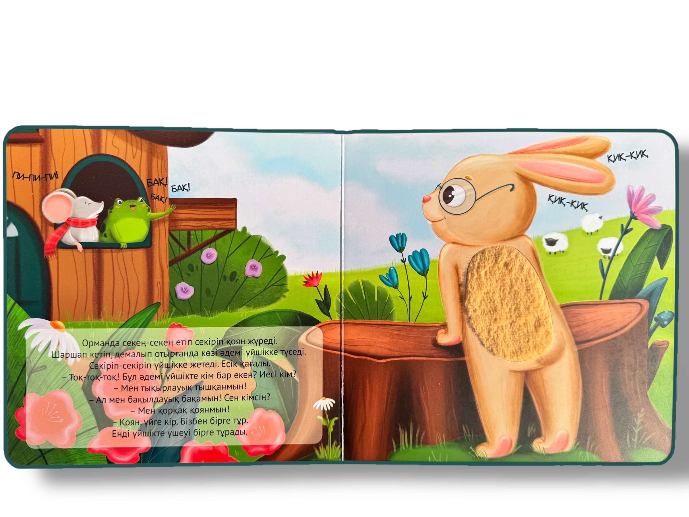 - Классикалық ертегі жаңа форматта ұсынылған: тактильді элементтер кітапты қызық әрі танымдық етеді.