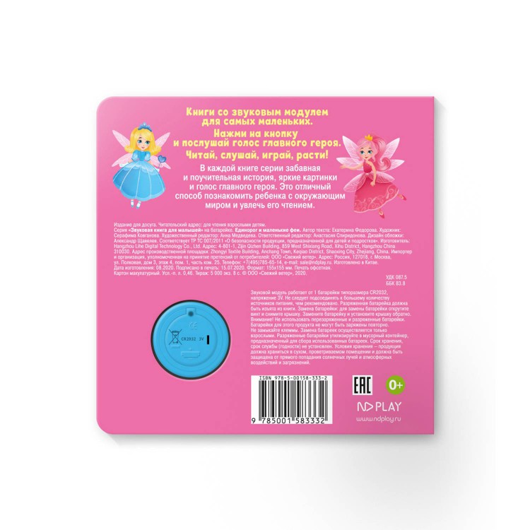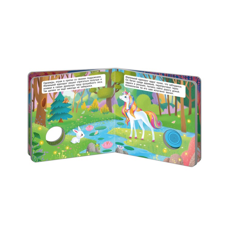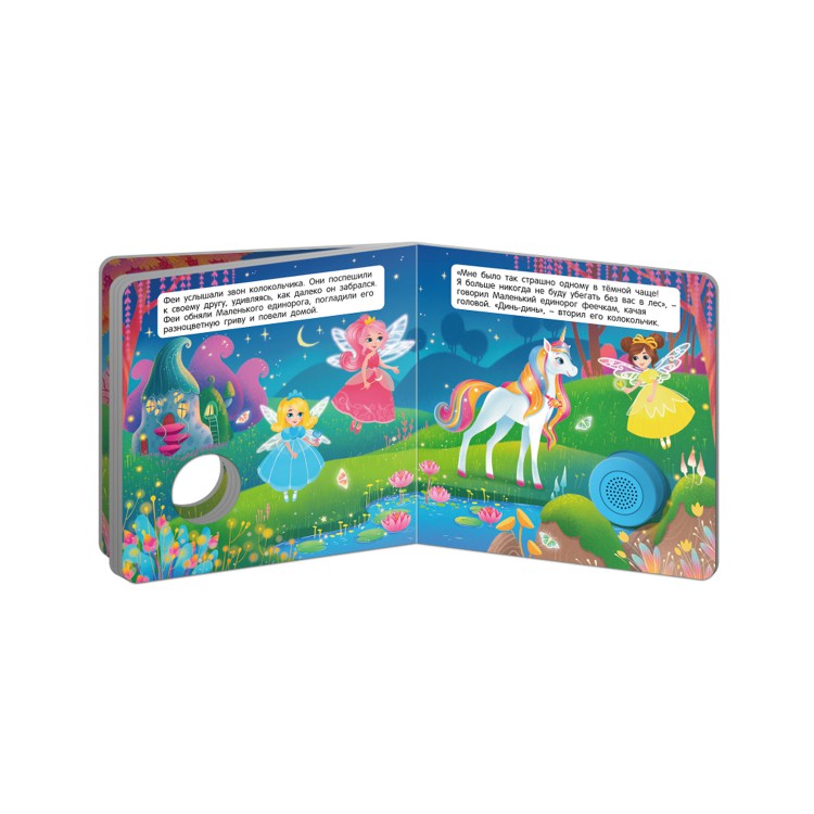 Звуковая книга "Единорог и маленькие феи" для самых маленьких читателей. В каждой книге серии своя забавная и поучительная история, яркие картинки с изображением веселых и добрых героев и музыкальный модуль с голосом главного героя. Это отличный способ познакомить ребенка с окружающим миром и увлечь его чтением. Малыш будет с удовольствием рассматривать яркие страницы и читать историю главных героев книги. Книжка сделана из плотного картона с глянцевой ламинацией, поэтому родители могут не опасаться, что ребёнок порвёт странички. Благодаря компактному формату (15,5х15,5 см) её удобно брать с собой в дорогу. Книжка укомплектована батарейками. Одна кнопка - один звук.