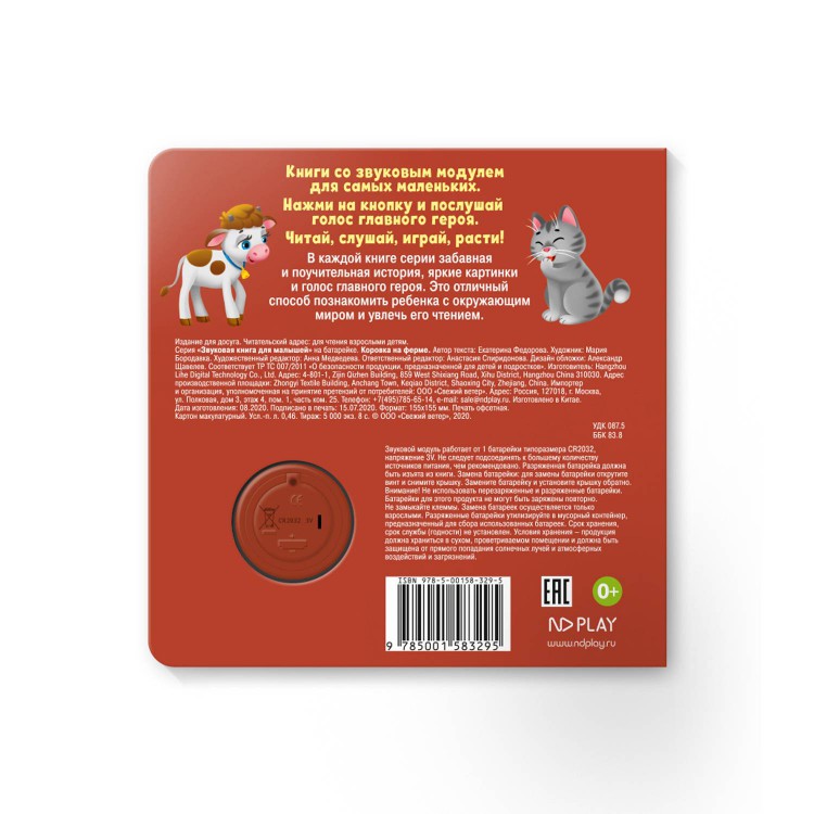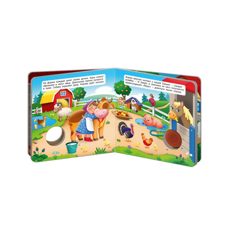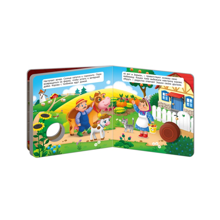 Звуковая книга "Коровка на ферме" для самых маленьких читателей. В каждой книге серии своя забавная и поучительная история, яркие картинки с изображением веселых и добрых героев и музыкальный модуль с голосом главного героя. Это отличный способ познакомить ребенка с окружающим миром и увлечь его чтением. Малыш будет с удовольствием рассматривать яркие страницы и читать историю главных героев книги. Книжка сделана из плотного картона с глянцевой ламинацией, поэтому родители могут не опасаться, что ребёнок порвёт странички. Благодаря компактному формату (15,5х15,5 см) её удобно брать с собой в дорогу. Книжка укомплектована батарейками. Одна кнопка - один звук.