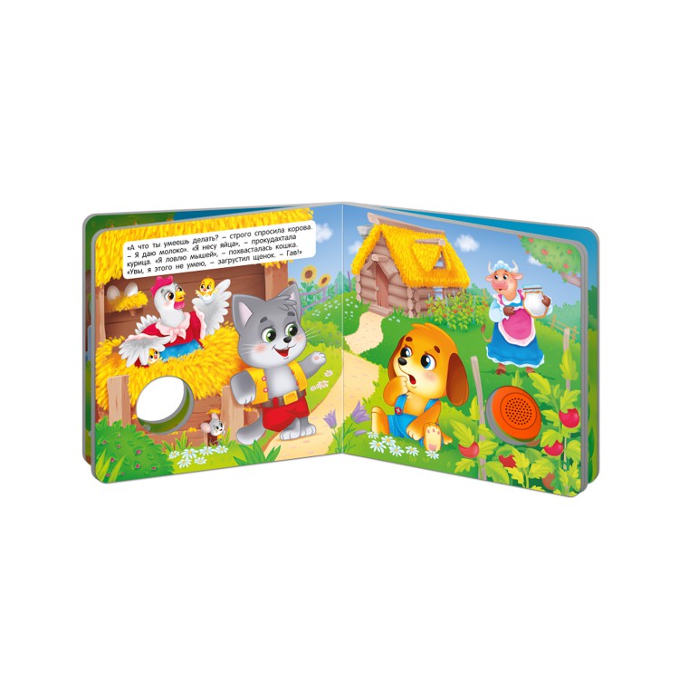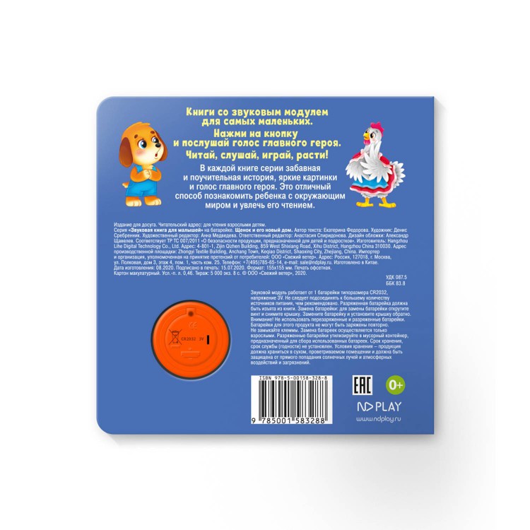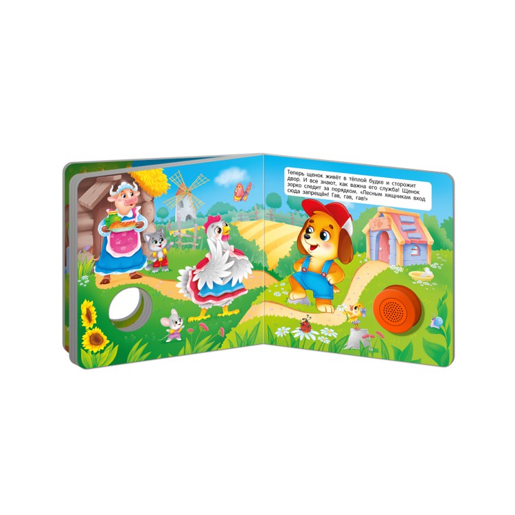 Звуковая книга "Щенок и его новый дом" для самых маленьких читателей. В каждой книге серии своя забавная и поучительная история, яркие картинки с изображением веселых и добрых героев и музыкальный модуль с голосом главного героя. Это отличный способ познакомить ребенка с окружающим миром и увлечь его чтением. Малыш будет с удовольствием рассматривать яркие страницы и читать историю главных героев книги. Книжка сделана из плотного картона с глянцевой ламинацией, поэтому родители могут не опасаться, что ребёнок порвёт странички. Благодаря компактному формату (15,5х15,5 см) её удобно брать с собой в дорогу. Книжка укомплектована батарейками. Одна кнопка - один звук.