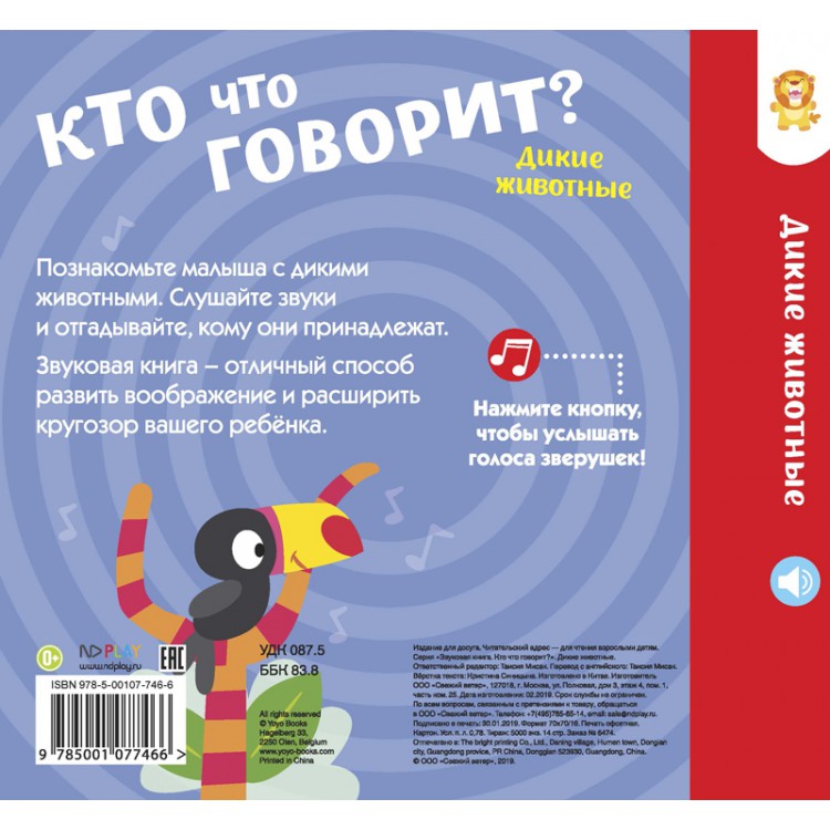 Познакомьте малыша с дикими животными. Слушайте звуки и отгадывайте, кому они принадлежат. Звуковая книга - отличный способ развить воображение и расширить кругозор вашего ребенка. Для эксплуатации использовать батарейки типов AG10, LR1130